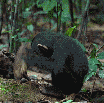 有一只相当于人类五六岁小孩子的黑猩猩,它也模仿大人去砸干果。拿着木棍去砸干果,砸一会发现不行。它思考一下觉得是干果太硬了,换一个砸还是不行,又换一个还不行。
