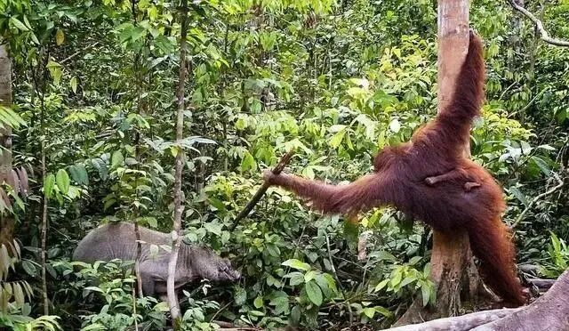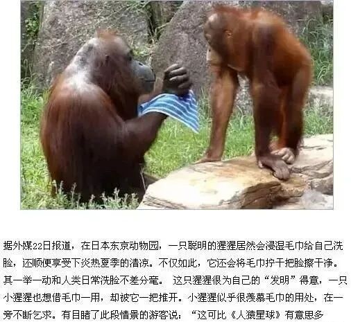 有个红毛猩猩,夏天热的时候,它知道把毛巾放到水里湿透,再拧掉水。然后用毛巾擦脸降温,和人用毛巾洗脸一样样的。