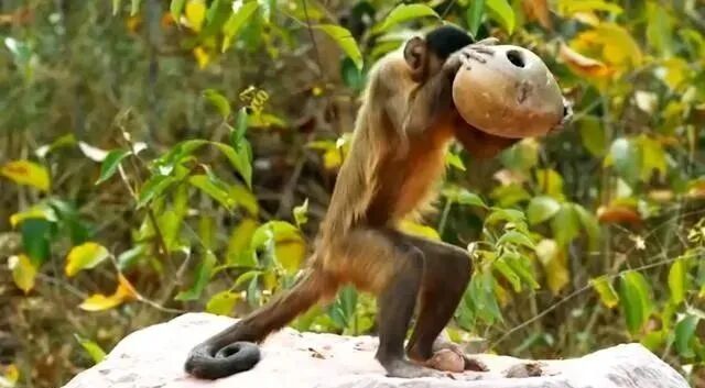 白脸卷尾猴在使用石头砸坚果的时候,还会寻找平坦的木头或者石块当做“砧板”垫在下边,把坚果放到砧板的凹槽里,防止用石头砸的时候把干果崩跑。