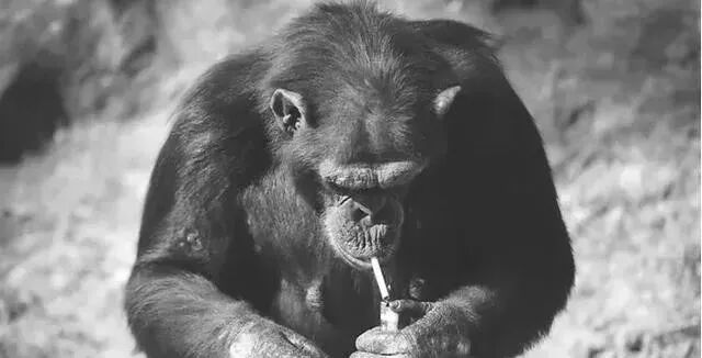 这只猩猩不学好,学抽烟,还会用打火机点火。这是谁家孩子,赶紧管管吧。