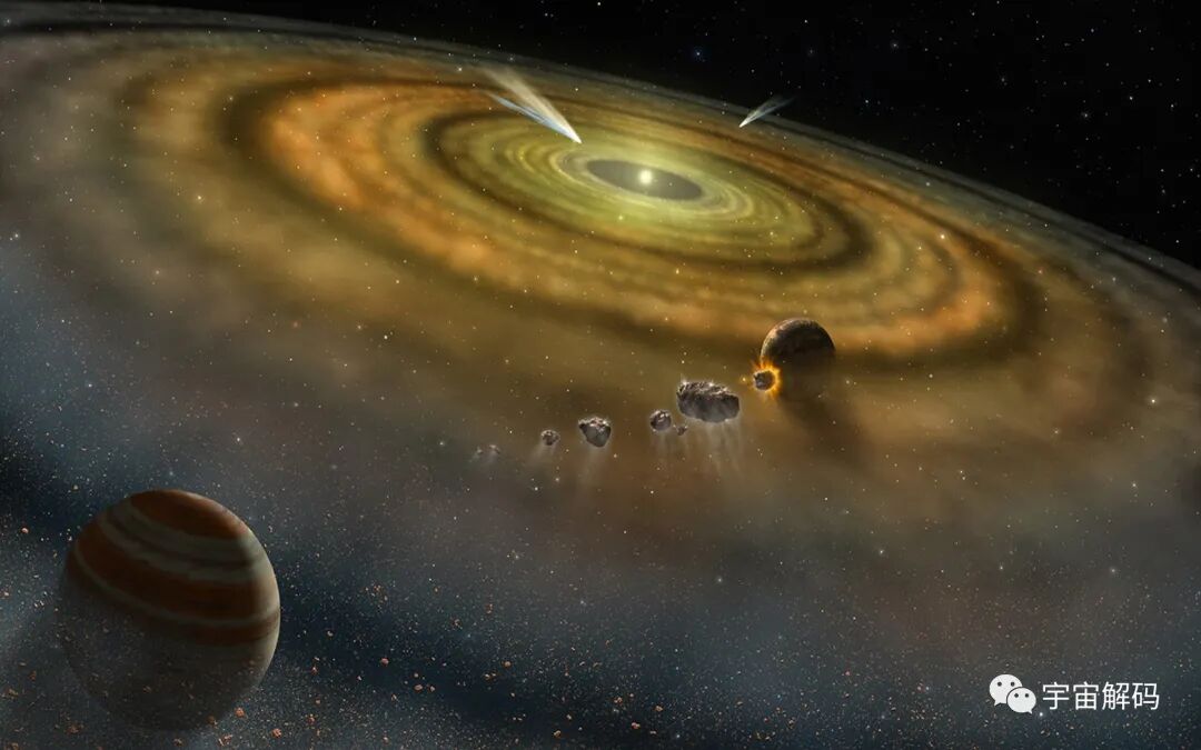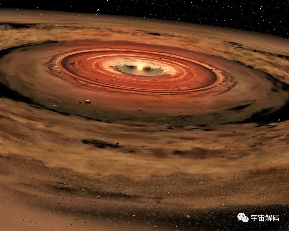 45亿年前的太阳系还是一个原始的行星盘,里面没有任何的天体,但其中包含着丰富的元素,涵盖整个元素周期表,当然这些元素已经在气体云中形成了各种化学分子,这些都是上一代恒星死亡后留下的物质。