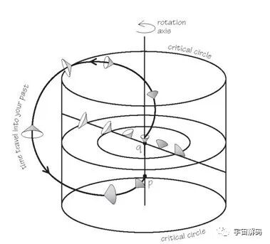 想象某物质沿着中心轴匀速转动,这将对光锥产生影响。光锥表示每一点所发出的光线所经过的地方。当我们离开中心时,光锥就开始倾斜,并扩大了开口,这是因为转动的线速度增大了。在距转动轴一定距离的地方,光锥完全翻倒,与空间相切,然后倒扣了起来,于是光线就沿着开口朝下(过去)运动。假设你的星球以前在p点,现在在q点。要想再次回到p点的话,你就要朝着临界圆外部的一个点加速运动,然后向过去运动到p点之前的某个地方,进入那时的临界圆,然后再向未来运动到p点。你总是在走向你的“未来”,但却回到了你的“过去”。