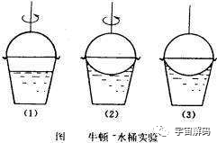 为此,牛顿用一个旋转的水桶说明这种绝对的空间观念,想象一根长绳下面吊着一个注入了水的水桶,如果我们顺时针转动水桶,吊着水桶的绳索就会卷起,但当我们松开水桶的时候,水桶就会逆时针旋转,而且将会越转越快,与此同时,桶内的水也将跟着旋转,正如牛顿所写的,水的表面“将逐渐从中间下降,而沿桶壁上升形成凹面。”不多久,水将和水桶一起旋转,最后水桶旋转将逐渐停止,而水面也将最终归于平静。