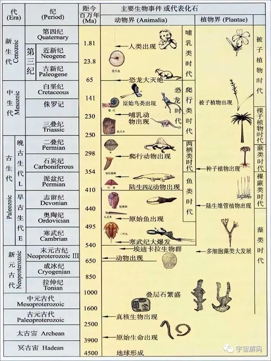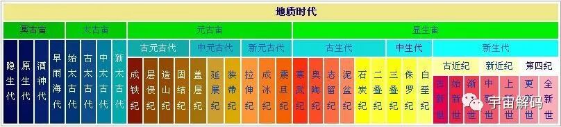 地质学家对地球的历史进行了划分,按时间跨度长度分别是:宙,代,纪和世。地球45亿年历史分为四个宙,分别是:冥古宙,太古宙,元古宙,显生宙。恐龙统治地球一亿多年的时代位于显生宙的中生代,侏罗纪和白垩纪。