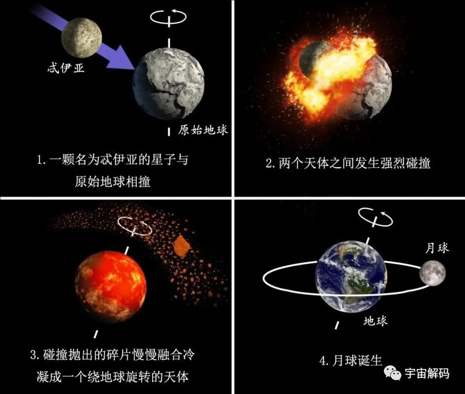 地球诞生后不久,就经历了地球历史上最重要的大事件:与忒亚星的碰撞。一颗火星般大小的忒亚星撞向地球,并没有与地球正面相撞,而是斜着相撞,撞击发生后大量碎片飞到太空中,之后慢慢聚集形成如今的月球。
