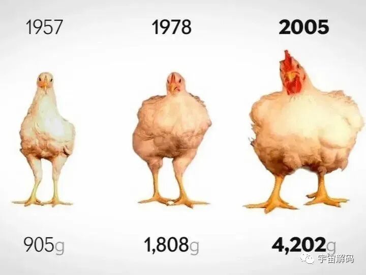 鸡肉在过去50年里增加了364%的体积,阴谋论者会说是打了激素。