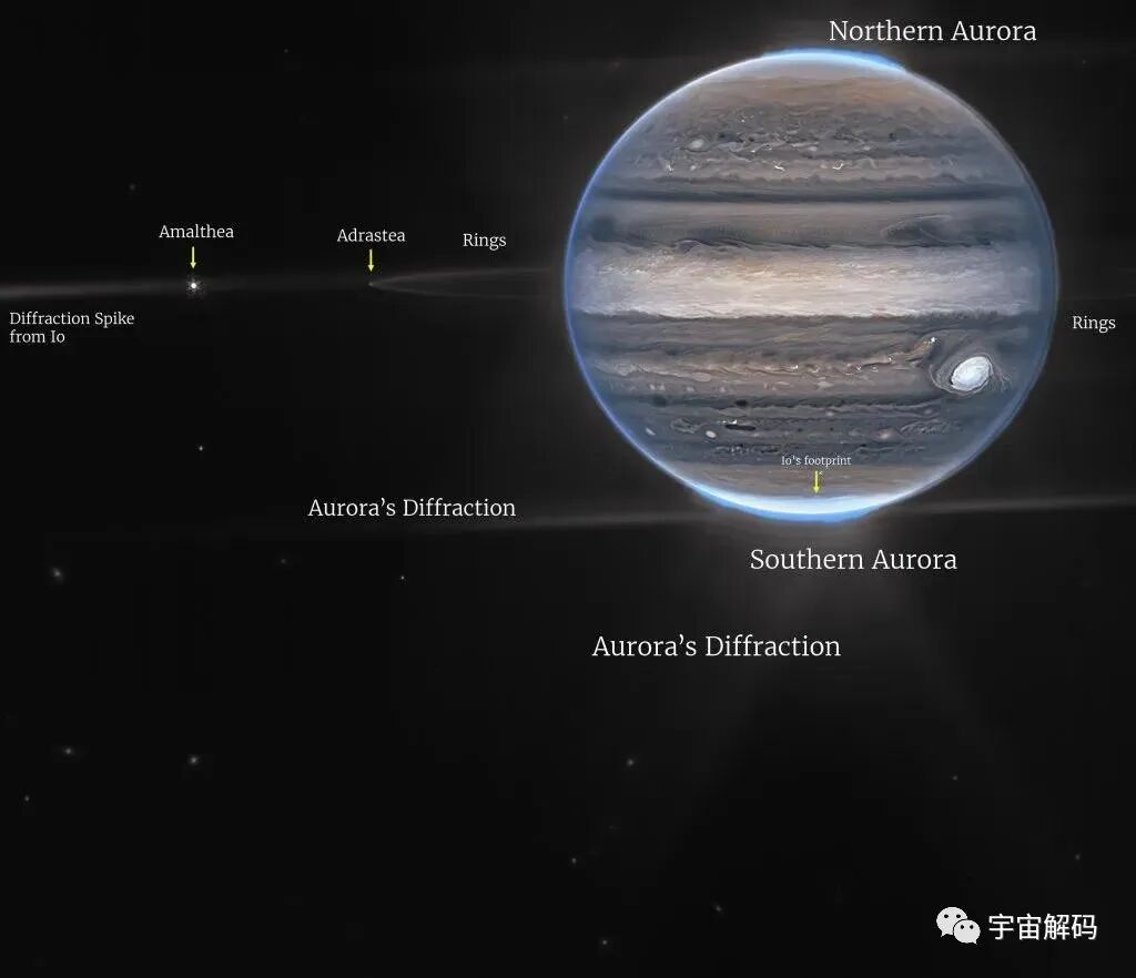 NASA的詹姆斯韦伯太空望远镜捕捉到的木星最新图像,可以看到木星大红斑、光环、卫星、极光等。