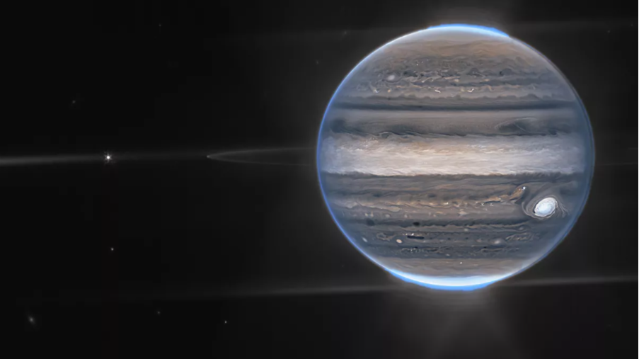 在新图像中,木星的两颗卫星阿玛耳忒亚(Amalthea,木卫五)和阿德拉斯特亚(Adrastea,木卫十五)在这颗气态巨行星的轨道上闪闪发光。木星微弱的光环特别值得注意,因为它不像土星那样被认为是一颗有环的行星。木星的北极和南极都散发着淡淡的光芒,展现了绚烂的北极光和南极光。此前,我们从未在一张图像中看到过木星全貌、木星环、木星极光、微小卫星等细节。
