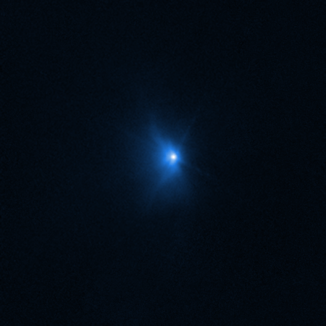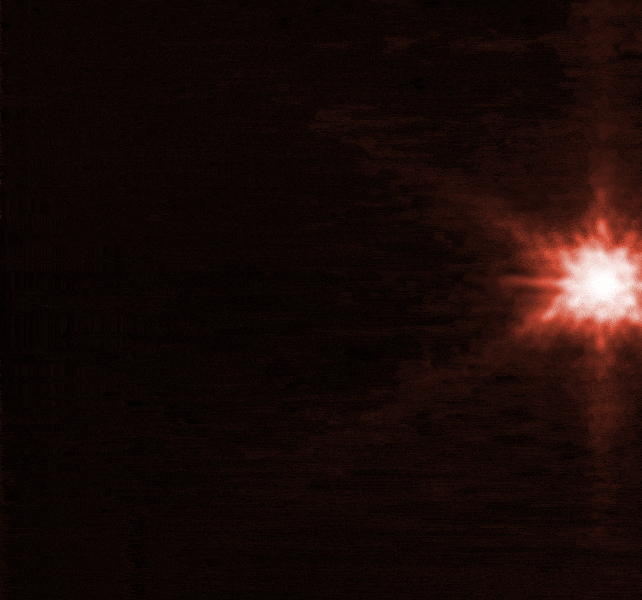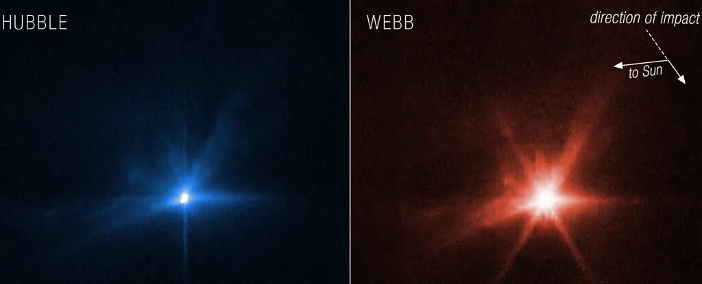 这些图像是在不同波长的光下拍摄的,哈勃望远镜展示了可见光的影响,而韦布则使用了红外仪器。图像的明亮中心显示了撞击点,该撞击点在几个小时内保持较高的亮度。(蓝色图像为哈勃拍摄,红色图像为韦布拍摄)