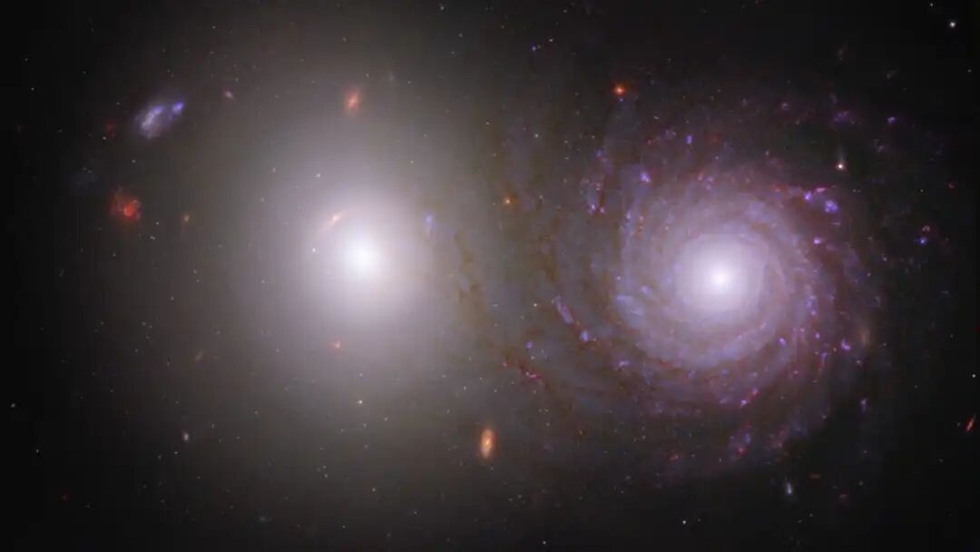 星系对VV 191的图像在左侧显示了一个漫射椭圆星系,在右侧显示了一个经典的螺旋星系。该视图融合了韦布的近红外视觉与哈勃对紫外线和可见光的观测。 韦布的天赋之一是它能够透过太空中的尘埃面纱看到底层结构,比如星系旋臂的“骨头”。将韦布图像与哈勃图像结合起来,可以让天文学家更全面地了解空间物体。