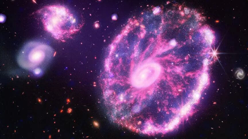 这个星系在1亿年前与一个较小的星系相撞时形成了独特的形状。随着较小的星系穿过车轮星系的中心,它也开始了一轮激烈的恒星形成。钱德拉的数据揭示了车轮星系中的X射线,这些X射线是由过热气体和单个爆炸的恒星,以及贪婪地以从伴星撕裂物质为食的中子星和黑洞发出的。