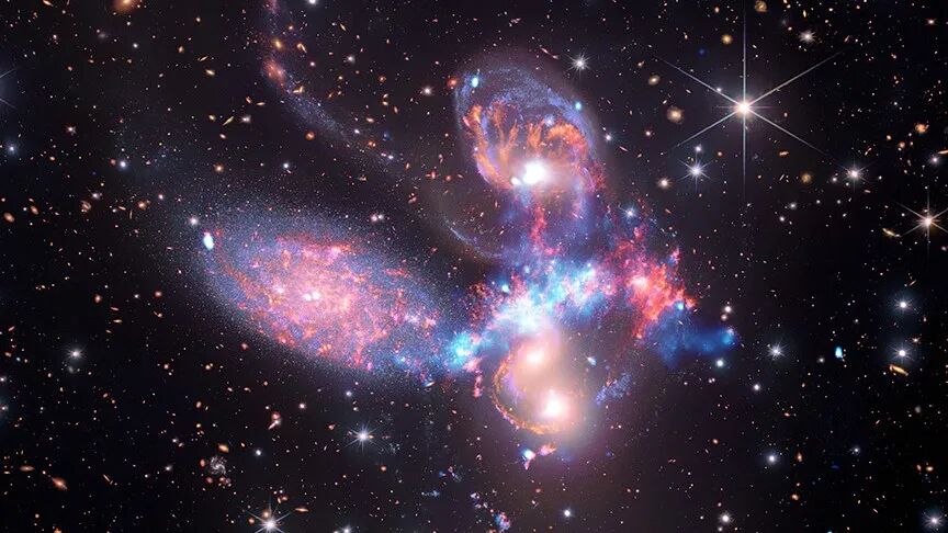 这些星系的JWST图像显示了天文学家以前从未见过的特征,特别是它们相互作用的结果,如气体尾巴和强烈恒星形成的爆发。当结合钱德拉和已退役的斯皮策太空望远镜的数据时,斯蒂芬五重奏的观测结果揭示了一种前所未有的冲击波将气体加热到数千万度,这种冲击波是由其中一个星系以大约300万公里/小时的速度穿过其他星系产生的。