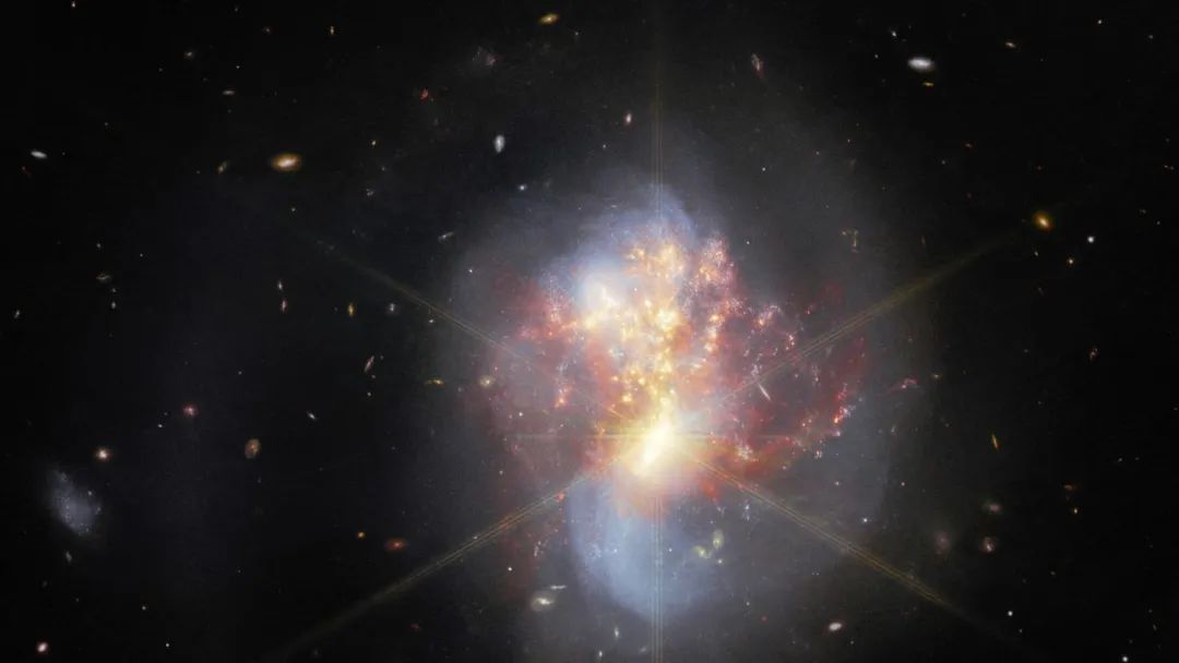 詹姆斯·韦布空间望远镜拍摄下两个星系的碰撞,并见证了其他望远镜看不到的大范围恒星形成。恒星诞生的浪潮是由两个共同命名为IC 1623的星系相互碰撞引发的,NASA表示,这对合并的星系正以比我们银河系快20倍的速度产生恒星。由于IC 1623被一层厚厚的宇宙尘埃包裹着,强如哈勃都无法深入观察星系内部以看到正在形成的恒星,只有詹姆斯·韦布望远镜依靠其强大的红外能力才能一窥究竟。