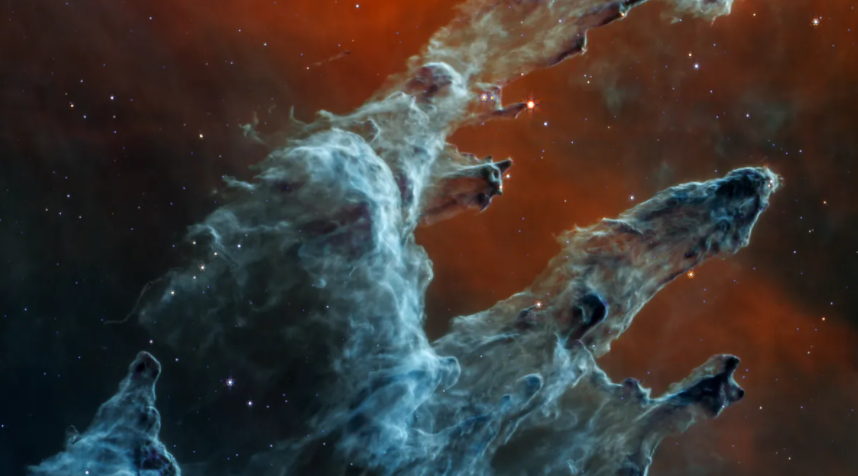 切换到韦布的中红外仪器,我们则第一次看到创生之柱如此令人毛骨悚然的图像。根据NASA的说法,在中红外波段观察场景会发现更多尘埃,这些尘埃掩盖了无数恒星的光芒。