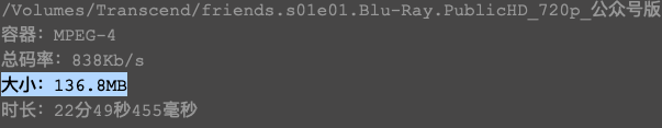 视频文件只有136M,小了近200M。码率更是掉到了838kb/s,少了1213kb/s,所以画质下降,这就是方便的代价。