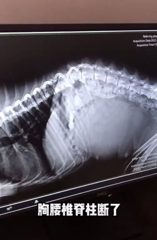 原来流浪狗的胸腰锥脊柱已经断了,导致它的神经受损,现在已经没有办法在自主排尿了,怪不得它浑身都湿透了。