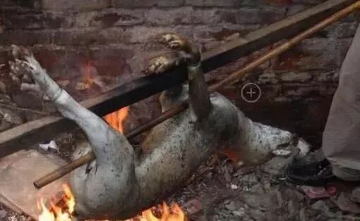 这些工人手头利索的,把狗的内脏掏出,之后用一根长长的竹竿架在火炉上面,在周围找了个木头以后,烧烤就此开始了。