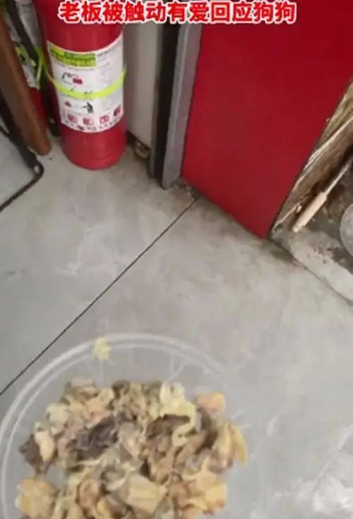 后来老板实在是看不下去了,就去厨房随便弄了一些吃的,装在碗里,放在地上给它吃。