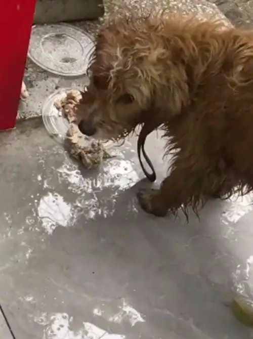 狗狗立马就吃了起来,开始了狼吞虎咽,它太久没有吃过东西了。