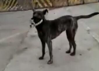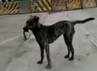 在一座大桥下的河堤旁,有一只黑色的流浪狗,它在河边捡到了一个项圈,于是就叼到了岸上,不断地将项圈往自己的脖子上戴。这应该是一只走失或者被遗弃的狗狗,它的主人曾经也亲自给它戴上了项圈,所以它认为自己有主人,想将项圈戴上。“主人说,街道上的流浪狗是会被抓起来的,我只要戴上项圈,他们就不会来抓我了,我就可以在这里等主人了”。
