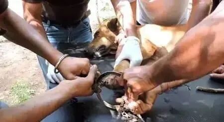 众人合力小心翼翼的将夹子掰开,随后紧急送往医院治疗。但由于前腿被夹了很久导致坏死,最终只能截肢。