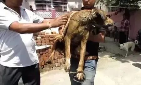 这只狗狗的前腿被一个大铁夹子牢牢的夹住,看样子已经很多天了,狗狗的前腿已经肿成脖子一样粗,铁夹子早已深深的陷入了肉里面,十分严重。