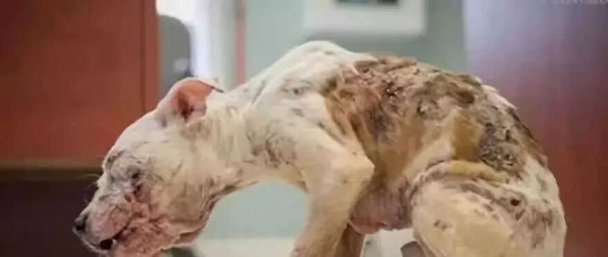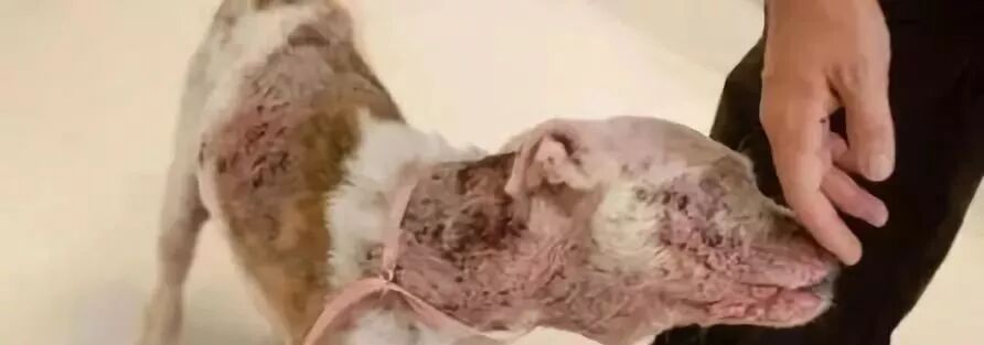 狗狗看上去瘦骨嶙峋的,身上百分之百分之五十的皮肤已经完全被细菌跟病虫占据。其他百分之五十的皮肤也没有一块是完好无损的。