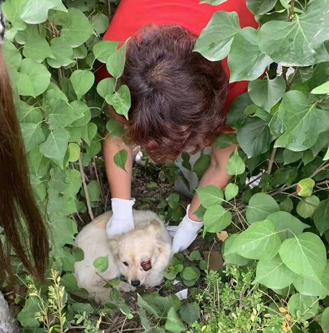 当梁霞想去救它的时候,它并没有攻击,只是跑到草丛角落里,一直不敢看着梁霞,“可能狗狗在流浪狗时候一直被人打,被人骂的,所以看到人很害怕。”
