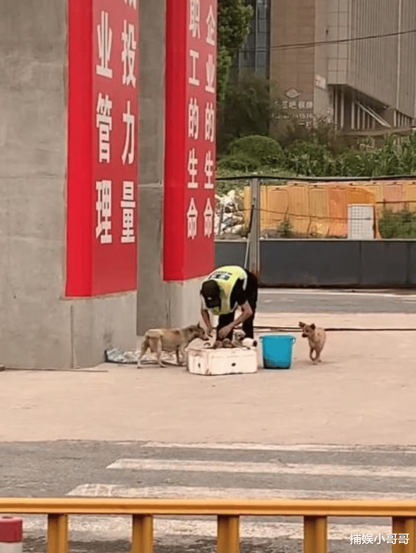 后来网友才了解到,原来这个保安很早就知道这窝小奶狗了,以前拿了件破衣服来,给它们垫上去,后来觉得这马路太过危险,就找来泡沫箱子,把狗妈妈和小奶狗放在里面,能够防止小奶狗乱跑,被撞伤。