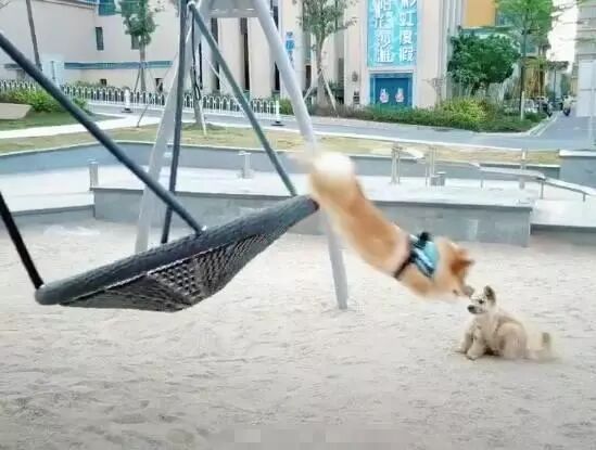准备好姿势柯基犬就要跳跃,谁知道,可能是动作大了点加上本身就要摇晃的秋千是有惯性的,柯基犬竟然直冲冲的冲到了前方,没刹住闸就一头直挺挺的摔倒在了流浪狗面前的地上,主人都没反应过来,看着翻车的柯基犬,特别像是行了一个五体投地大礼一样,流浪狗狗一脸诧异,这是咋的了?为何要行如此大礼?