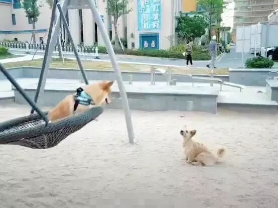 一位网友在经过自己居住小区的娱乐设施的时候,就看到了一只被主人放在秋千上荡着秋千的柯基犬,看柯基犬的那个表情,显然是相当享受被主人推来推去荡来荡去的感觉了,突然有一只流浪狗走在了柯基犬的旁边,并坐了下来,看着有主人疼爱的柯基犬,流浪狗狗的眼中流露出来了非常羡慕的神情。