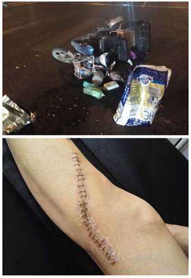 前年5月因为义工送了一些狗粮,高俊玲想着给它们改善生活,就晚上开电瓶车去喂毛孩子,也许因为太累了,不小心遭遇车祸,造成左膝盖粉碎性骨折,医生为了保全她的左腿取了一块右腿骨头放在左膝盖上!