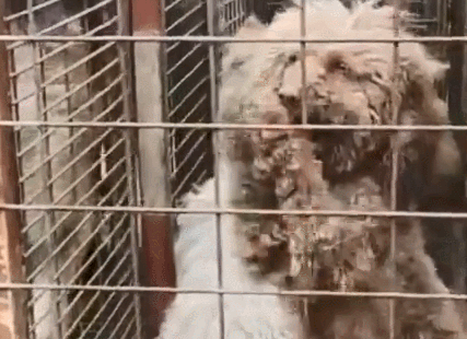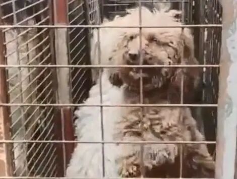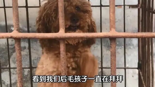 只见院子里摆放了大大小小数不清的笼子,关着不同品种的狗狗。有土狗,也有品种犬。它们的精神都十分萎靡,显得十分绝望。只有一只泰迪犬,情绪显得很激动,只要看着有人来,就不停的站起来作揖。