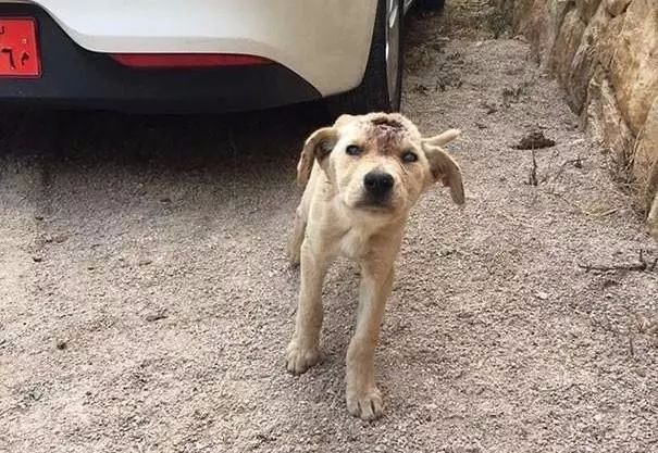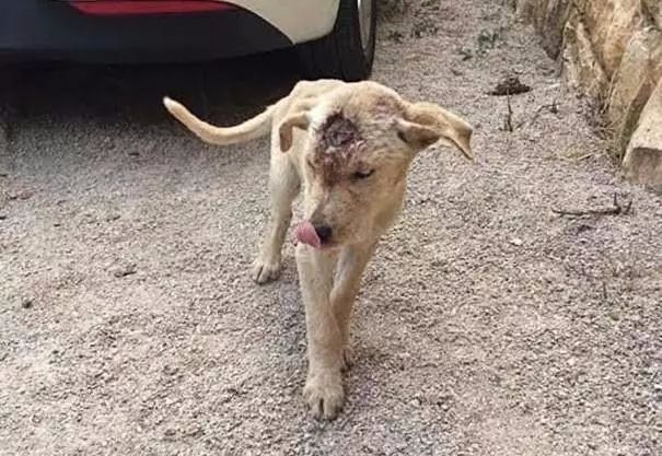 受伤的狗狗是一只中华田园犬,名字不详,但是后来的发现人叫它小黄。起初发现人和朋友在外散步,突然间迎面走来一只奇怪的狗狗,摇晃着身体,头部貌似缺少一块,随时感觉要倒的样子。她们赶紧向前快跑,想去看看这只狗狗到底怎么了。当她们靠近它时,真的被它受伤的样子吓到了。