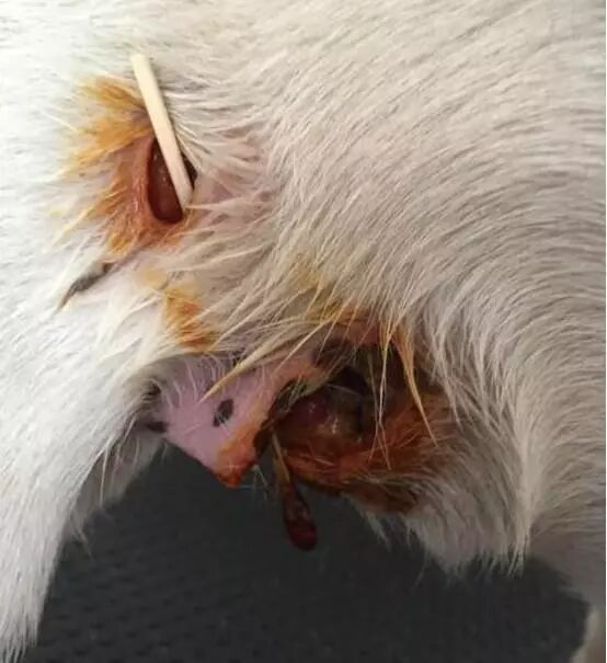 这就是流浪狗狗的伤口,看起来真的让人觉得施暴者非常的残忍,这只狗狗被服务员用筷子戳穿了肚子这样的行为真的让人觉得太过分了,而服务员当时下手的时候竟然没有半分的犹豫。