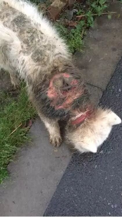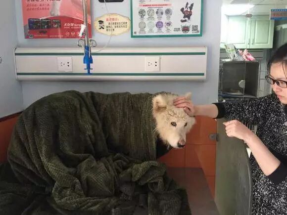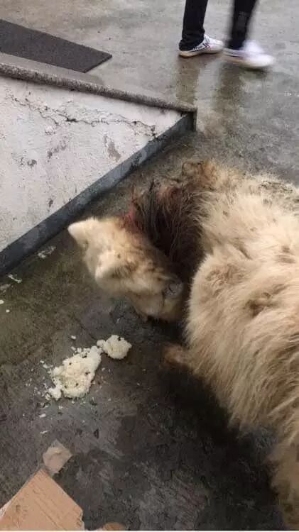 而且靠近头部的皮肤也是鲜血直流,,皮毛都不在了,并且伤口上已经长了虫。狗狗的眼神满是可怜,令人悲伤。那个女子的怜悯之心油然而生,怎么会有这么狠心的主人?