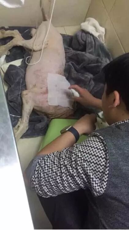 医生说狗狗之前受到了很严重的虐待,它的身上的大部分皮肤已经坏死。更不幸的是,它的很多部位都有炎症。