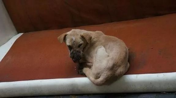 志愿者发现这只可怜的狗狗时,它独自躲在角落里呜咽,志愿者的到把它吓得不轻,看来是对人类有阴影了。最终在志愿者的努力下,它被抱上车子。