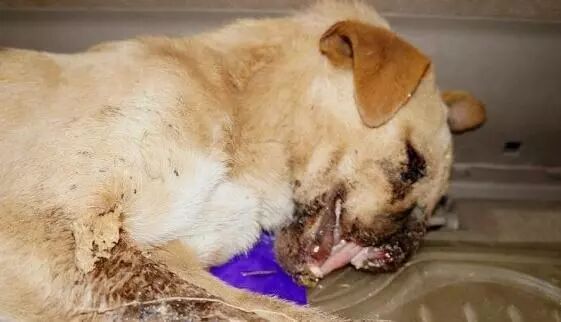 狗狗在车上很安静,估计是出于一种半昏迷状态吧,嘴巴被炸成了这个样子,真是可怜。