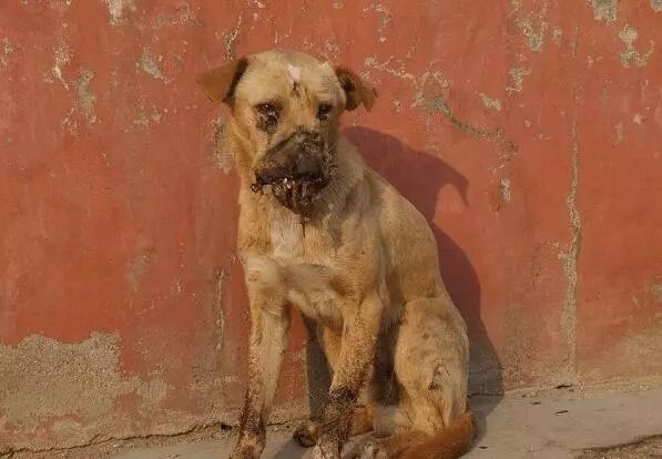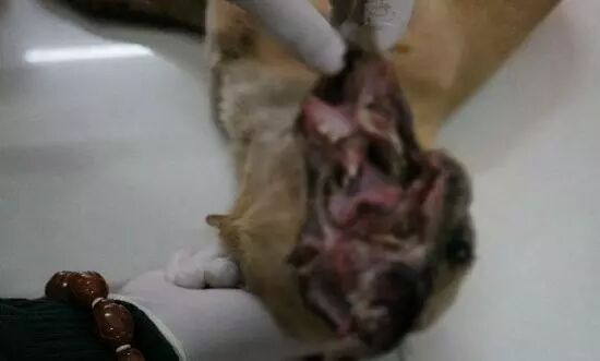 这是一只被炸伤嘴的流浪狗,上颚及鼻子全被炸掉,下颚断了,无法进食。疑因嘴里被人塞入鞭炮。送进医院时医生建议安乐死,但志愿者仍未放弃…