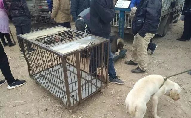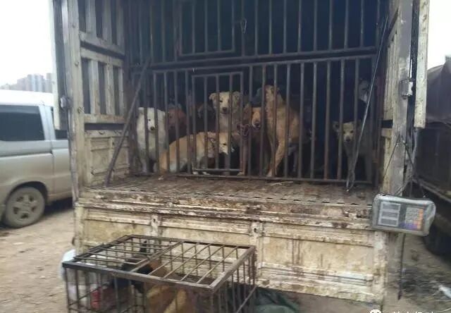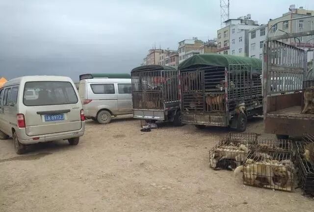 图中各式各样的宠物狗被关在车笼子里,里面不乏有一些品种犬,比如萨摩耶犬、马犬等等。这些被沦为淘汰犬的宠物狗,其实他们的出售价格并不昂贵,大多都以8元1斤的价格出售给肉狗商贩。