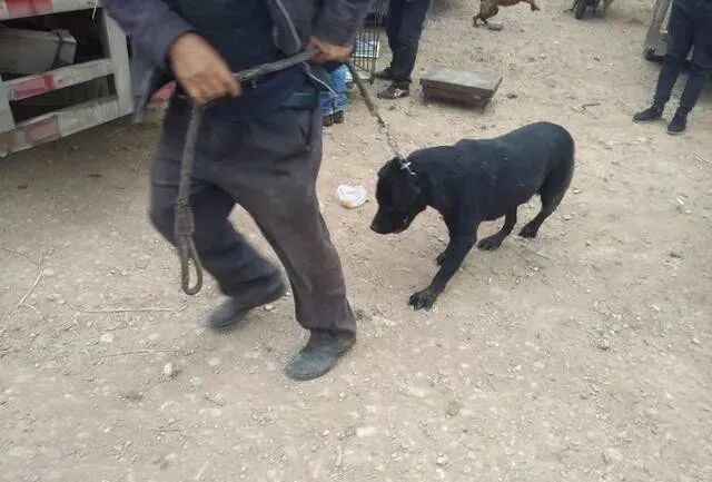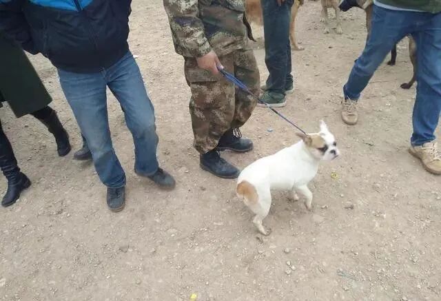 图中的这只斗牛犬也是被迷彩服男子拉到狗市里进行出售,笔者并没有了解到迷彩服男子是狗主人还是狗场主,不过从图中我们也可以清晰的感受到这只斗牛犬被销售的原因,也很一目了然,也是因为他血统不纯正,没有血统上的经济价值,那么卖不出好的价格,也不能做繁殖的种犬,所以也只能当做肉狗来处理。