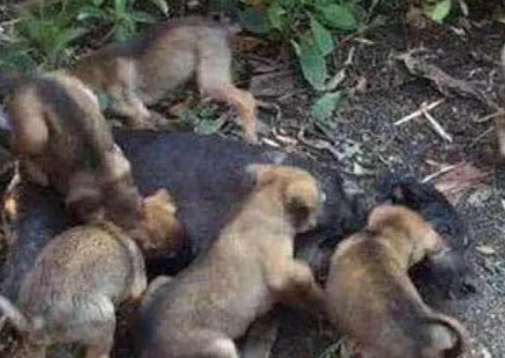 早上打扫城市卫生的保洁人员首先发现了这一家人,而保洁人员发现的时候他看到狗妈妈已经去世了,只是它怀中的小狗狗们并不知道,还在朝自己的妈妈要奶喝,估计小狗也是饿得受不了,所以死死的跟着妈妈。