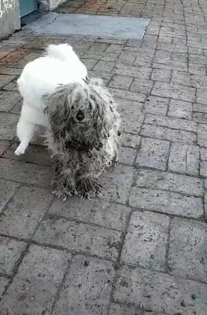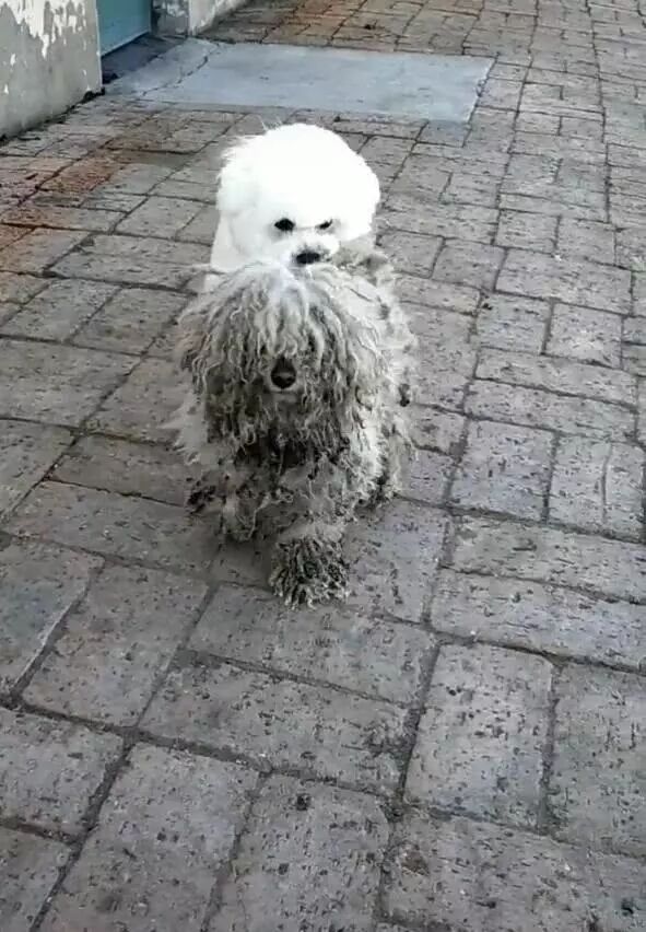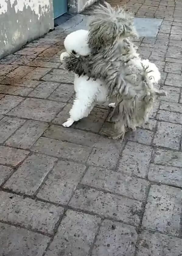 狗妈妈估计最少有一年半载没有洗过澡了,所以身上的毛发都已经脏到结块了,所以现在狗妈妈和孩子有着非常大的差别,狗妈妈很脏,很不好看,孩子很白,很可爱。