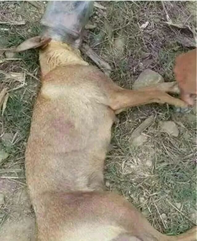 据都市快报,几个小孩把火腿肠放进一个大的玻璃瓶里,让饿肚子的流浪狗把头伸进去吃,吃完后狗狗才发现上当了,头根本拔不出来,几个小孩随后追狗,狗狗受不了瘫倒在地,一名路过的大人看到急忙上前制止,但是遗憾的是,弄开瓶子后狗狗已经死亡。
