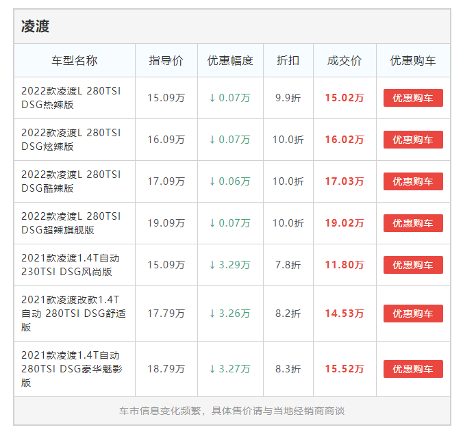 大众凌渡近一个月的成交价最大折扣达到了7.82折,新车现金最高直降3.29万元,新车全国售卖11.80万元起。点价格仅供参考,实际成交价以当地经销商为准。