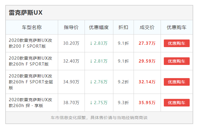 本站调研收集了雷克萨斯UX的近一年的真实成交价,雷克萨斯UX近一个月全国最低成交价为27.37万,新车最高现金优惠2.83万元,新车最大折扣达到9.06折!价格仅供参考,实际成交价以当地经销商为准。