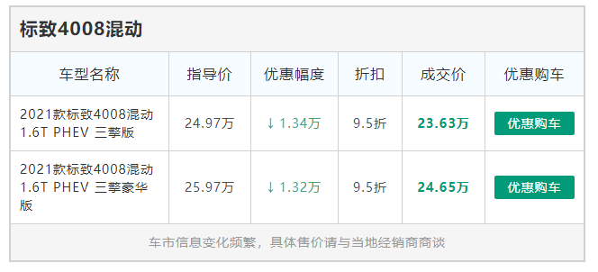 本站采集了标致4008混动的真实成交价,标致4008混动近一个月全国新车现金最高直降1.34万,最大折扣达到9.46折,本站全国实时采集价格,实际成交价请以当地经销商折扣为准。