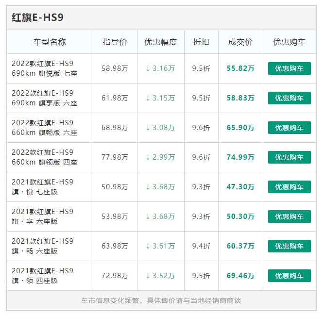 红旗E-HS9近一个月的成交价最大折扣达到了9.28折,新车现金最高直降3.68万元,新车全国售卖50.30万元起。点价格仅供参考,实际成交价以当地经销商为准。