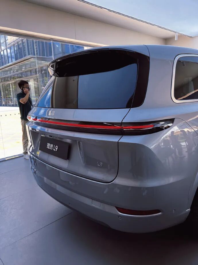 3.外观设计亮点:那盏据说有两米长的环形日行灯,销售说那是理想首创技术,别的品牌一直在模仿它们,且有的人说像小鹏G9,其实实车看着完全不像,G9我在广州车展拍过,比这个还是小不少的,这种贯穿环形灯是立体结构,非单独分开,一体成型的视觉效果不错,但车头看显得很矮,和车尾那种拔高拔高的视觉感反着来,估计还是为了降低风阻,我的理解;尾部的L9字样看着有点廉价不高级,而且总感觉会跑着跑着就掉了,字样太小,车太大,所以会有这样的视觉差;